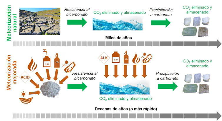 Las rocas reaccionan de manera natural con el agua de lluvia, que disuelve gradualmente los minerales que las forman, llegando a romperlas. Las rocas ricas en magnesio y calcio reaccionan con el CO₂ atmosférico y el agua formando soluciones carbonatadas alcalinas, atrapando ese CO₂ fuera de la atmósfera. Este proceso, conocido como meteorización, ocurre regularmente en la naturaleza, y permite atrapar el CO₂ atmosférico y almacenarlo en minerales carbonatados durante centenares o miles de años, de forma que dejan de contribuir al efecto invernadero.