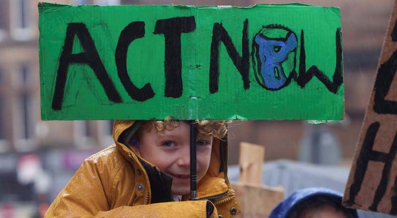 Un niño sostiene un cartel mientras la gente protesta durante la Conferencia de las Naciones Unidas sobre el Cambio Climático (COP26), en Glasgow, Escocia, Gran Bretaña. (REUTERS/Yves Herman)