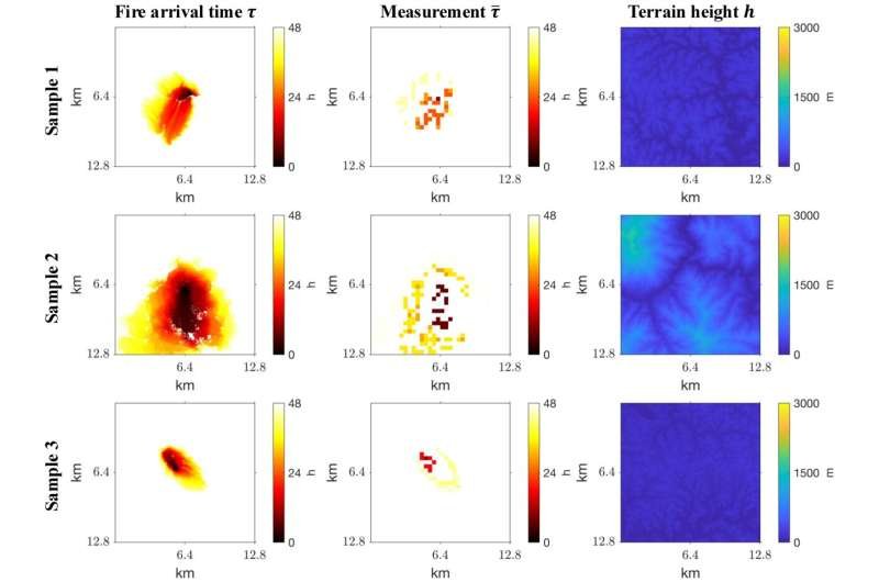 Muestras de datos de entrenamiento, con las soluciones de tiempo de llegada del fuego objetivo 𝝉 en la primera columna, las mediciones ¯ 𝝉 en la segunda columna y la altura del terreno 𝒉 en la tercera columna. Crédito: Remote Sensing (2026). DOI: 10.3390/rs18020227