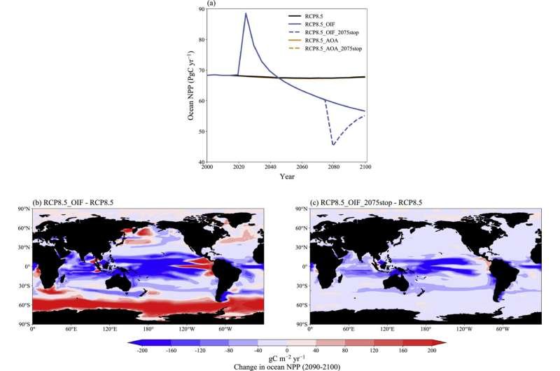 Series temporales de la NPP oceánica global para las simulaciones RCP8.5, RCP8.5_OIF, RCP8.5_AOA, RCP8.5_OIF_2075stop y RCP8.5_AOA_2075stop. Las curvas para RCP8.5, RCP8.5_AOA y RCP8.5_AOA_2075stop prácticamente se superponen. (b, c) Distribución espacial del cambio en la NPP oceánica (ambas relativas a la simulación RCP8.5) para finales del siglo XXI (media de 2090-2100) para las simulaciones RCP8.5_OIF y RCP8.5_OIF_2075stop, respectivamente. Crédito: Atmospheric and Oceanic Science Letters (2025). DOI: 10.1016/j.aosl.2025.100717
