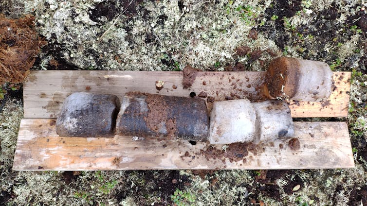 Testigo de permafrost de unos 40 cm. Se observa una parte superior, en contacto con la capa activa, rica en materia orgánica congelada, y una parte inferior donde predomina la presencia de cuñas de hielo. Nicolás Valiente