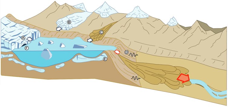 En estas circunstancias, se favorece una situación en la que se puede desprender por gravedad una porción importante de hielo (en inglés, el fenómeno denominado calving), que invade de manera repentina la laguna que se sitúa cercana al glaciar (laguna proglaciar).