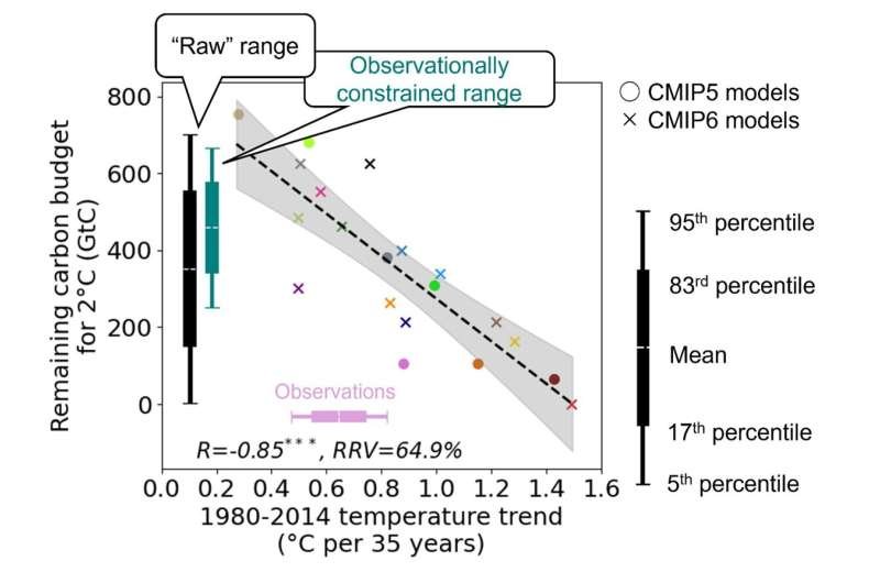 Estudios previos que no consideraron el grado de concordancia con las observaciones estimaron el presupuesto de carbono restante para limitar el calentamiento a 2 °C en aproximadamente 352 000 millones de toneladas de carbono, con un amplio rango de incertidumbre de entre 2 000 y 702 000 millones de toneladas. Al considerar el grado de concordancia entre el modelo del sistema terrestre y las observaciones, el análisis refinó esta estimación a una media de 459 000 millones de toneladas, con un rango de incertidumbre más estrecho de entre 251 000 y 666 000 millones de toneladas, mejorando así sustancialmente la precisión de la proyección.