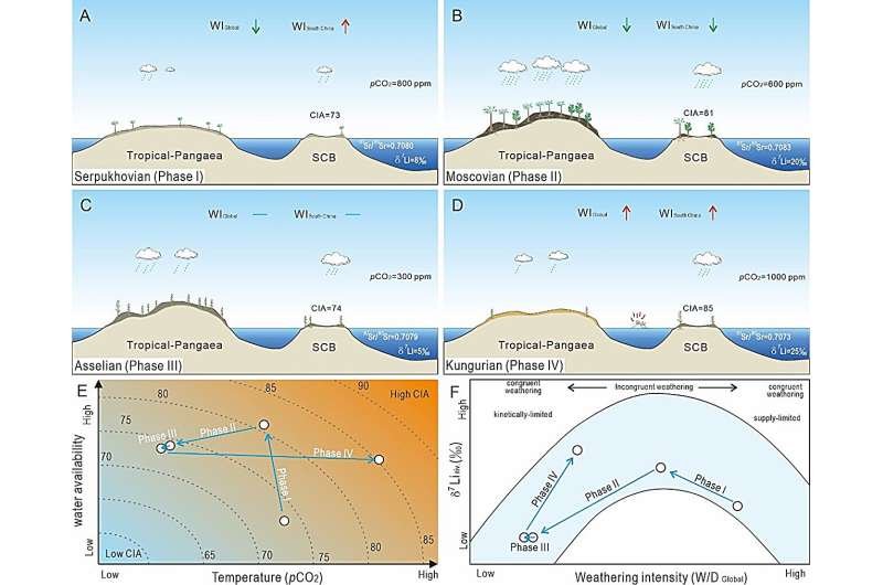 El registro de la CIA del sur de China reveló un patrón de cuatro fases en la intensidad de la meteorización continental regional. Fase I (333–316 Ma): El aumento de la intensidad de la meteorización se debió principalmente a la rápida expansión de los bosques paleotropicales (probablemente acompañada de un mayor nivel de precipitaciones), no a cambios en la pCO₂ atmosférica . Fases II–IV (316–275 Ma): La intensidad de la meteorización mostró una fuerte correlación con la pCO₂ atmosférica, lo que indica que el clima (y no las plantas) se convirtió en el factor de control dominante.