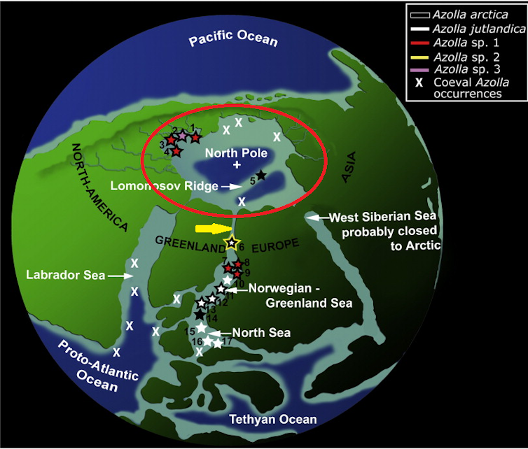 Hace unos 49 millones de años (ma), el planeta era un lugar mucho más cálido y Azolla abundaba en el océano Ártico. Los registros fósiles muestran que durante aquel período del Eoceno enormes poblaciones de este helecho crecieron y se reprodujeron flotando en un océano entonces cerrado. Este organismo y los abundantes microfósiles orgánicos y silíceos de agua dulce que lo acompañan indican una subida episódica de las aguas superficiales del Ártico durante un intervalo de aproximadamente 800 000 años conocido como el evento Azolla.