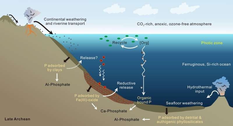 Ilustración del ciclo P revisado en la Tierra Arcaica. Crédito: Nature Communications (2026). DOI: 10.1038/s41467-026-69293-4